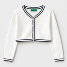 Questo adorabile cardigan bianco è un'aggiunta chic e versatile al guardaroba della tua piccola! Realizzato in un morbido cotone, presenta un design cropped e un colletto sportivo decorato con un elegante bordo blu. I bottoni frontali lo rendono pratico e facile da indossare, perfetto per completare un look fresco e alla moda. Ideale per le fresche serate estive o per strati durante le giornate primaverili, è in buone condizioni nonostante sia un capo usato. Un must-have per ogni piccola fashionista che ama il comfort senza rinunciare allo stile!